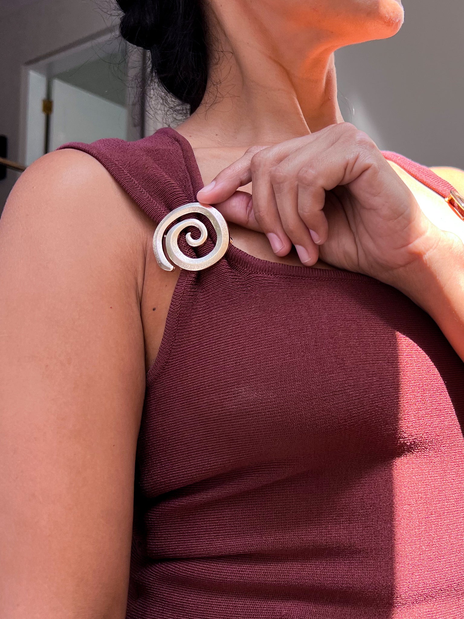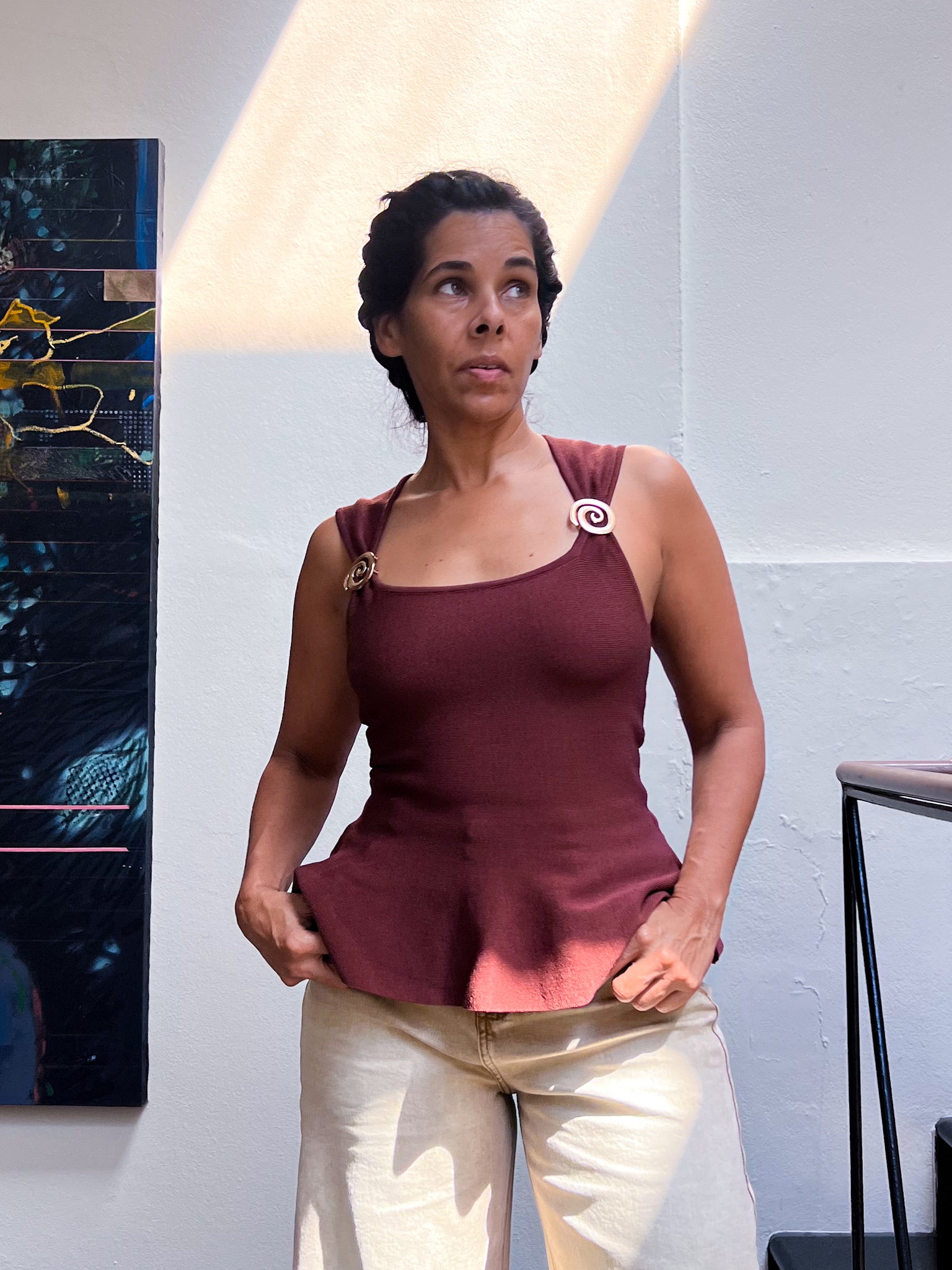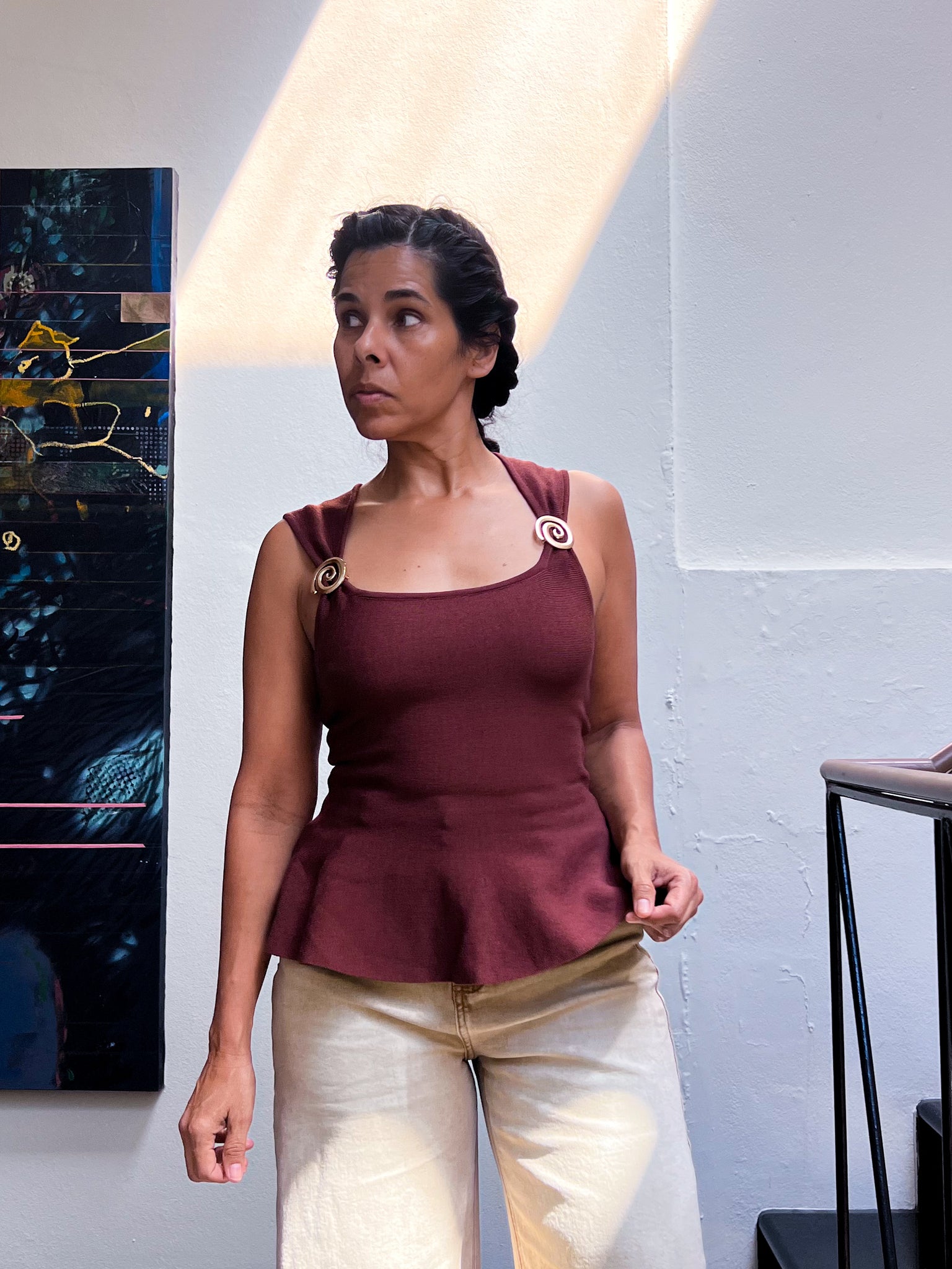 El Terracotta Muse Top combina un tono marrón terracota profundo con una estructura que define la cintura y realza la silueta. Sus detalles espiral en los hombros aportan un acento artístico sutil que transforma una pieza minimalista en una declaración sofisticada.